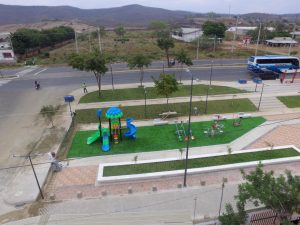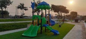 Instalación de juegos de parque y césped artificial para área de esparcimiento al aire libre.