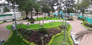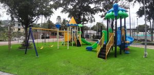 Instalación de juegos de parque y césped artificial para área de esparcimiento al aire libre.